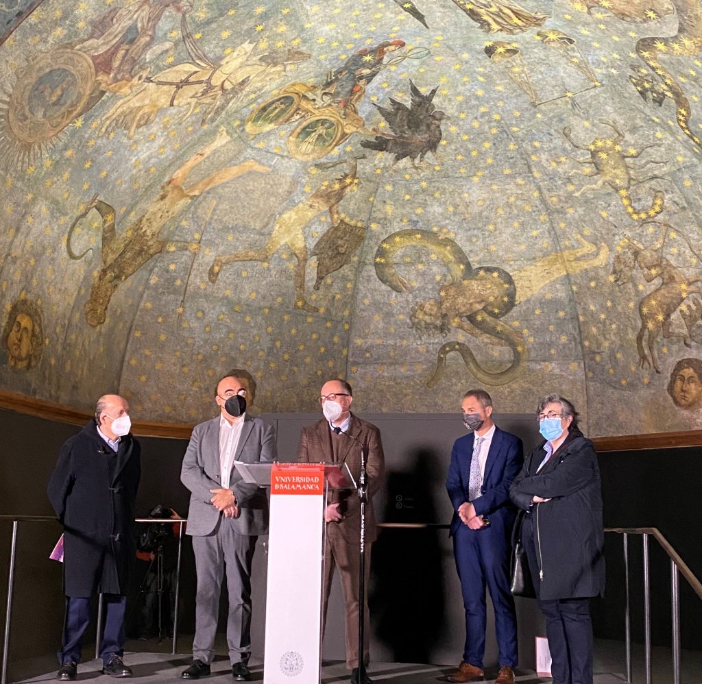 Esta mañana la Universidad de Salamanca ha presentado el estudio “Astronomía en la Universidad de Salamanca a finales del s. XV. Lo que nos cuenta “El Cielo de Salamanca”, estudio realizado por el investigador Carlos Tejero Prieto que revisa el contexto científico en torno a la famosa bóveda celeste del s. XV de la Universidad de Salamanca y actualiza las teorías sobre el firmamento representado, y cuyo trabajo será publicado próximamente por La Revista Española de Física.