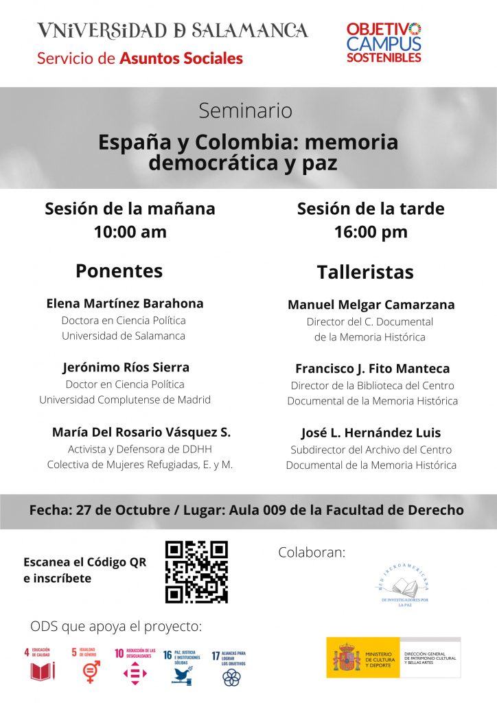 Estas actividades se enmarcan en la convocatoria Campus Sostenibles 2021-22. Son dos sesiones, este jueves día 27 de octubre desde las 10 de la mañana en el aula 009 de la Facultad de Derecho. Allí, presentados y moderados por Érika, intervendrán en un conversatorio Elena Martínez Barahona, con la presentación de la Ley de Memoria Democrática, Jerónimo Ríos Sierra de la Complutense de Madrid con el tema los escenarios de la paz en Colombia y los aportes de España y Alba Teresa Higuera Buitrago del colectivo Mujeres refugiadas, exiliadas y migradas que hablará de los movimientos sociales y perspectiva feminista en la construcción de paz en Colombia.