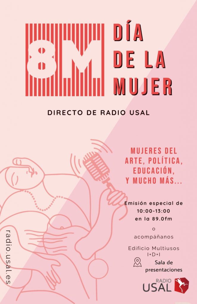 Este martes te invitamos a vivir con la radio el Día Internacional de la Mujer. Habrá programación especial todo el día, desde las 10 de la mañana que empezaremos con emisión abierta al público y en directo desde el I+D+I de la calle Espejo, con testimonios y aportaciones del gran equipo de la radio universitaria y que culminará a las 8 de la tarde con un directo internacional, bajo la coordinación de Esther Martínez Quinteiro, directora de la RED RPARU, del Observatorio Radiofónico de violencia de género USAL y de la Red de Derechos Humanos DPDH/USAL, con la participación de especialistas investigadores y docentes de Brasil y España. Síguenos y acompáñanos este 8 de Marzo. Además tendremos actuaciones musicales durante el directo, llevadas a cabo por Rebeca Gea Martínez que está realizando el doctorado en Musicología en la Usal y por Ángela Jimeno Esteban estudiante de Musicología que tocará la flauta travesera.