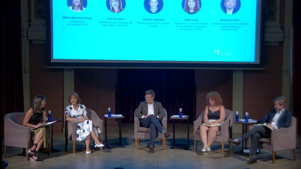 Sobre las conclusiones del informe han charlado hoy Eva Ferreira, rectora de la Universidad del País Vasco (UPV/EHU); Antonio Iglesias, director general de Endeavor España; Alba Lirón, estudiante y vocal del Consejo de Estudiantes Universitarios del Estado (CEUNE) y Rosauro Varo, presidente de GAT Inversiones y vicepresidente de Movistar Plus+. Temas como capacitación, cualificación adquirida en la universidad, la empresa, la sensación de pertenencia de los jóvenes a la universidad, la necesidad de mejorar pero también de atacar determinados bulos en torno al sistema universitario español, la percepción internacional y la necesidad de internacionalización de la universidad española, fueron abordados, entre otros, en esta mesa de debate.