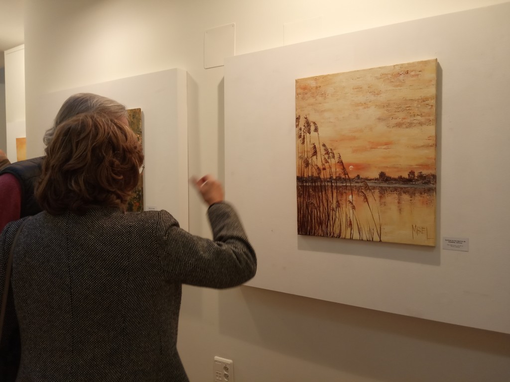La exposición, compuesta por trece piezas, ha sido realizada de la mano de la profesora de la Universidad de Salamanca Mª Isabel Álvarez Gallego, quién revive los atardeceres y recuerdos de su infancia en las comarcas de Tierra del Pan y Tierra de Campos, dónde se encuentran su pueblo natal, Torres del Carrizal y la Laguna de Villlafáfila, en Zamora. La autora, describe los escenarios como “paisajes llanos, en los que apenas se veía un árbol diferente de un frutal y donde las calles sin asfaltar se confundían con casas de adobe. Estos pueblos parecían monocromáticos.”. En especial, se detiene a hablarnos sobre una pieza que se inspira en las lagunas de Villafáfila (Fotografía).