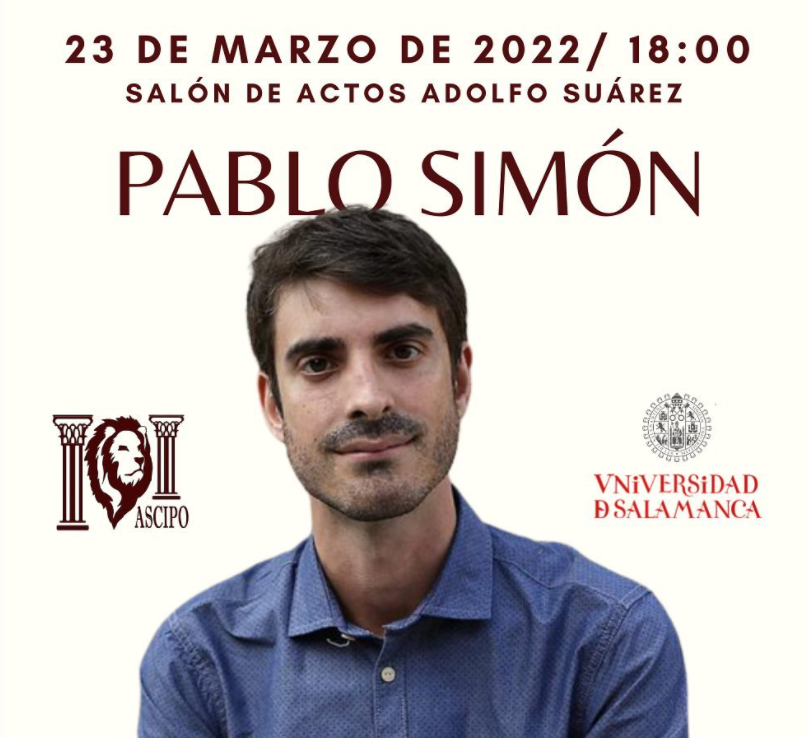 Este 23 de marzo, la Asociación de Ciencia Política y de la Administración Pública de la USAL ASCIPO, contará con la participación de Pablo Simón, politólogo y comentarista político español, en el Salón de Actos Adolfo Suárez a las 18:00h. Es una actividad que ASCIPO realiza con la idea de fomentar la política desde el punto de vista académico. Desde la Radio Universidad de Salamanca os invitamos a participar en la actividad, o a seguir el directo de la radio a las 18 horas, en la FM, 89.0 o en radio.usal.es.