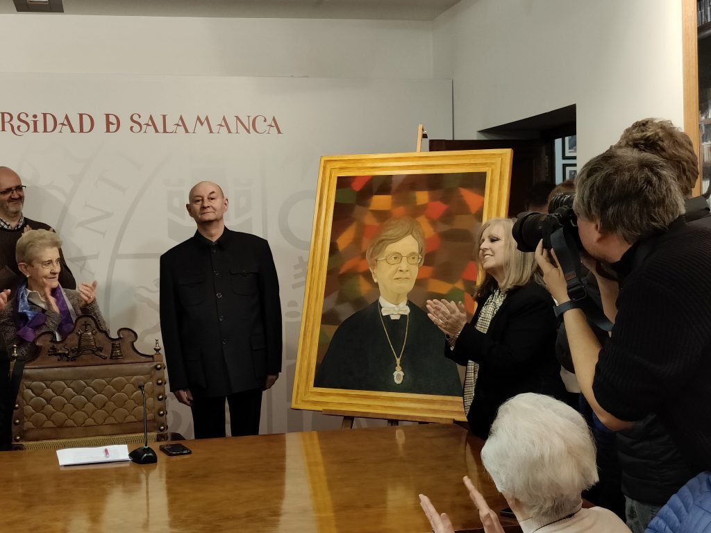Ricardo Rivero, junto a la directora de la Unidad de Igualdad, Inmaculada Sánchez Barrios, presenta el retrato de María Dolores Gómez Molleda, que se incorpora a la Sala de Retratos del Rectorado. También se encontraba presente el autor de la obra, José María Larrondo Fraile.