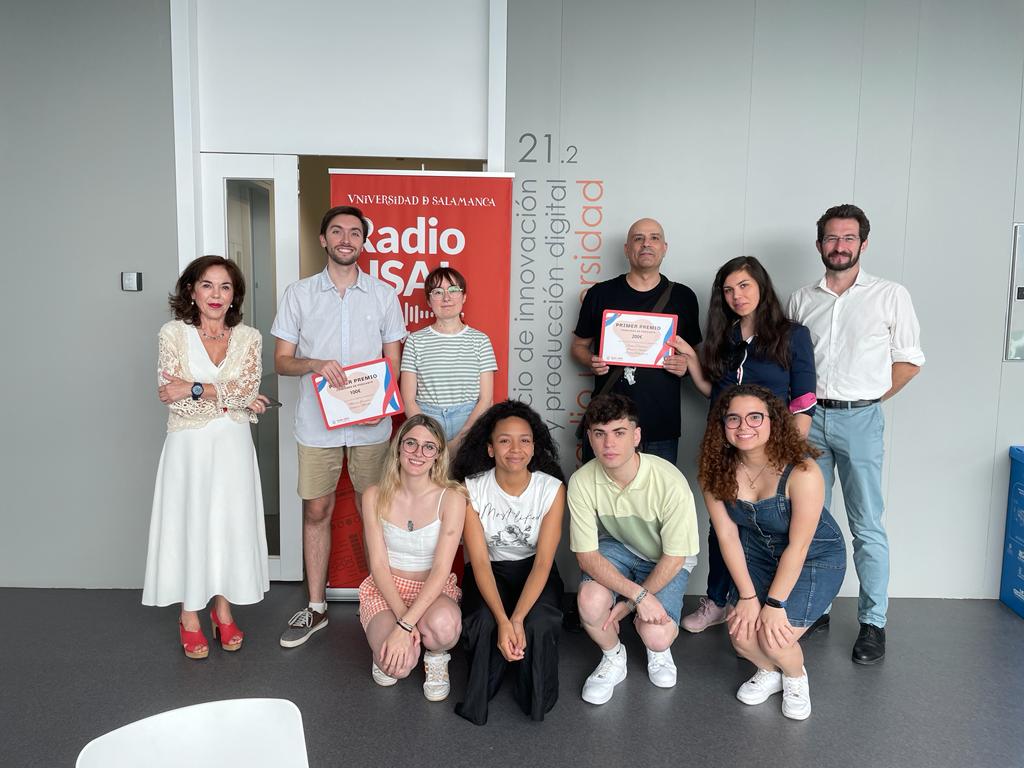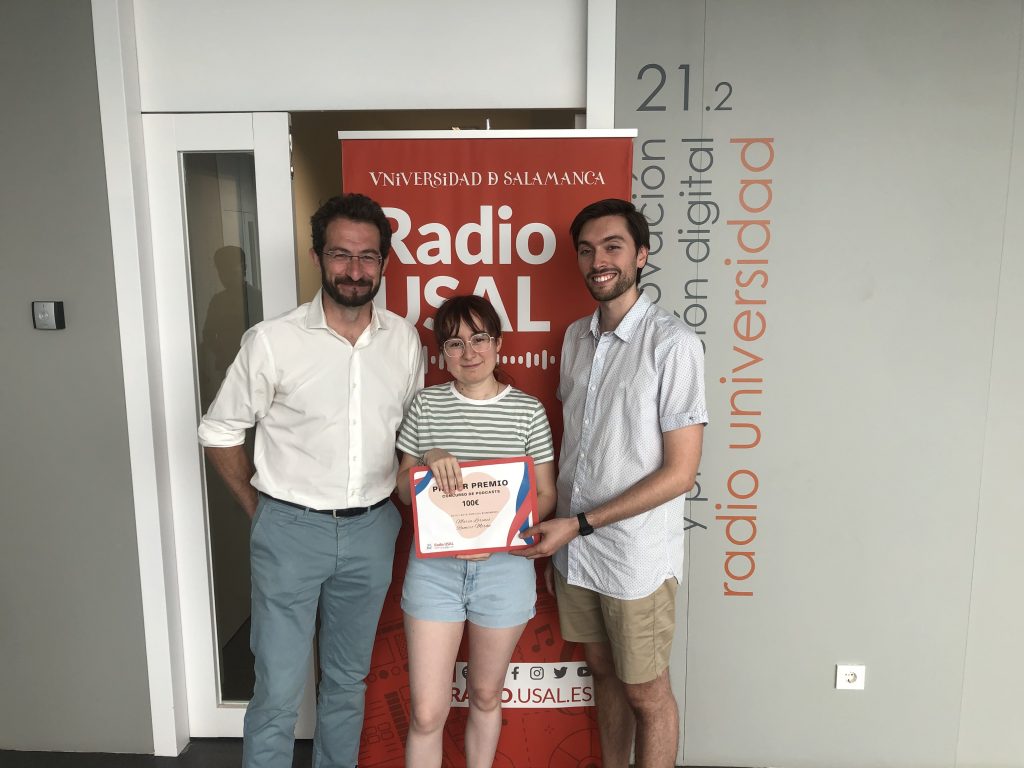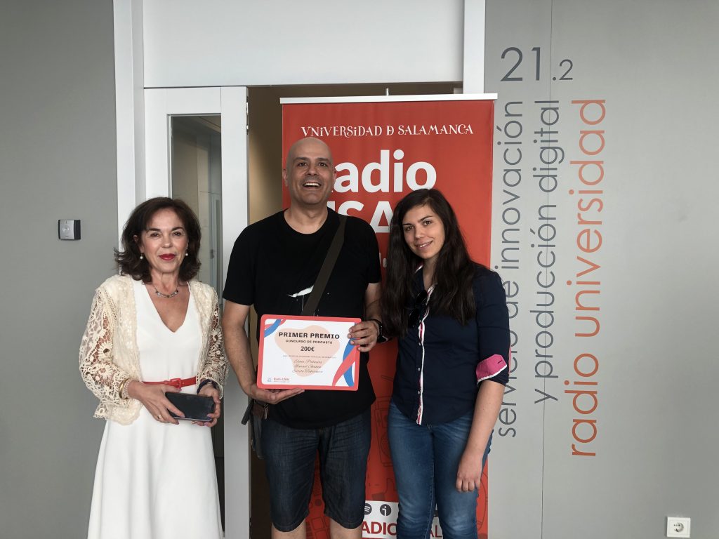 Los ganadores del primer premio han sido los antiguos alumnos de la USAL, Elena Palacios e Ismael Shahín, con la colaboración de Estela Tabernero, con su podcast “Mar Interior. Programa Especial Informativo”. Elena Palacios graduada en Trabajo Social, es natural de Ciudad Rodrigo y actual trabajadora social en Cáritas en la misma ciudad. Ismael Shahín, es salmantino, licenciado en Historia del Arte por la USAL y cuenta con numerosos artículos y libros sobre historia, fotografía y arte. Estela Tabernero estudió en la UPSA Comunicación Audiovisual e hizo un Máster en Comunicación Deportiva.