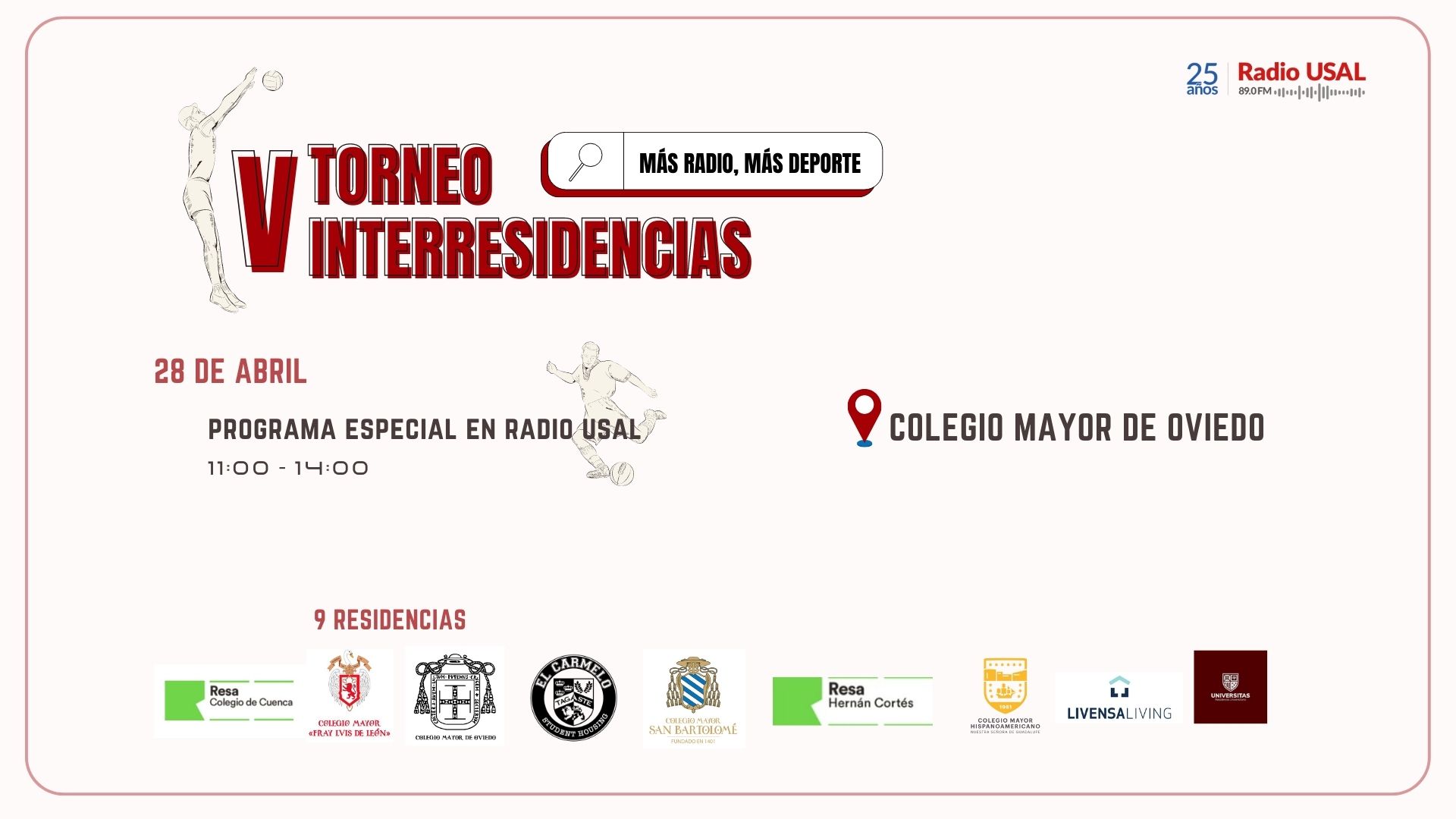 La radio de la Universidad de Salamanca inauguró el pasado viernes 28 de abril el Torneo Interresidencias de la USAL, con una emisión especial desde el Colegio Oviedo con gran despliegue de medios y de buenos profesionales de la comunicación y el deporte. Una mañana inolvidable, cargada de mesas que podéis volver a escuchar.