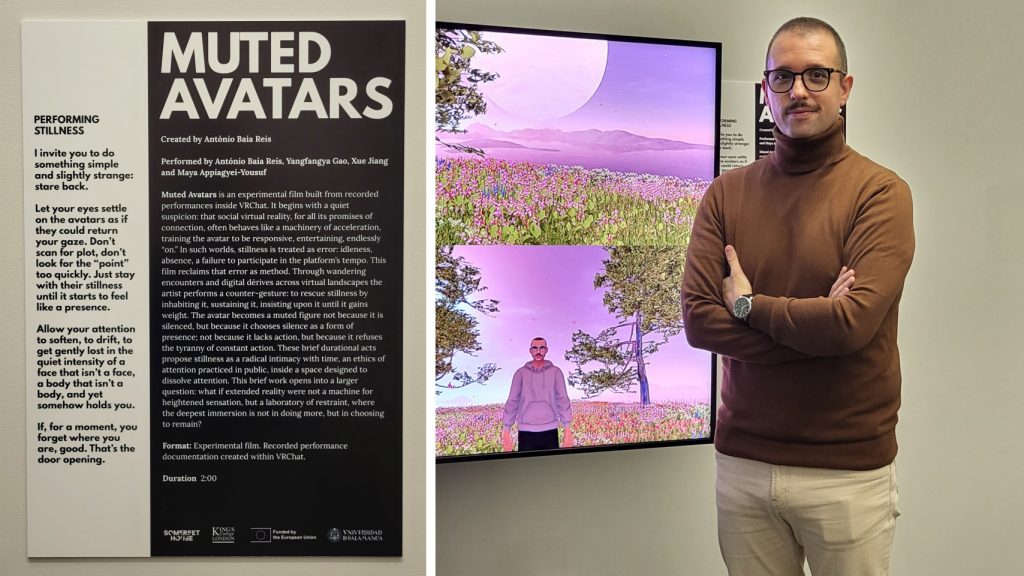 Y siguiendo en el continente, aunque ya no forma parte de la Unión, nos acercamos al Reino Unido donde António Baía, del grupo de investigación CaUSAL presenta una instalación cinematográfica en Somerset House de Londres. “Muted Avatars”, su creación se presenta en este espacio artístico del Reino Unido, que es visitado por más de 3 millones de personas cada año. La obra propone una mirada crítica sobre la realidad virtual social desde las nociones de atención y presencia, interrogando cómo habitamos (y qué perdemos) cuando nos relacionamos a través de avatares.